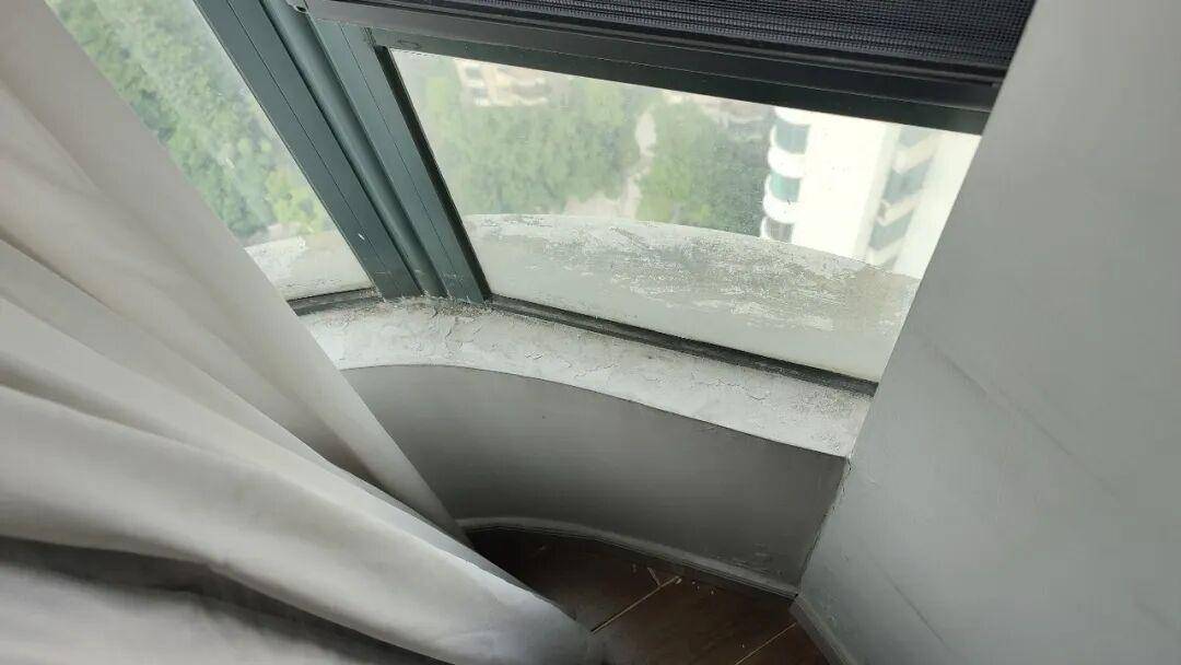 入住第一年的台风天,就发现窗户漏雨了,水顺着窗框流到窗台,把窗台泡得掉皮了。才发现是密封胶老化+门扇五金损坏,雨水是径直从窗框缺欠渗进来的,不仅墙面饱读包掉皮,窗台边缘也有发霉迹象了。